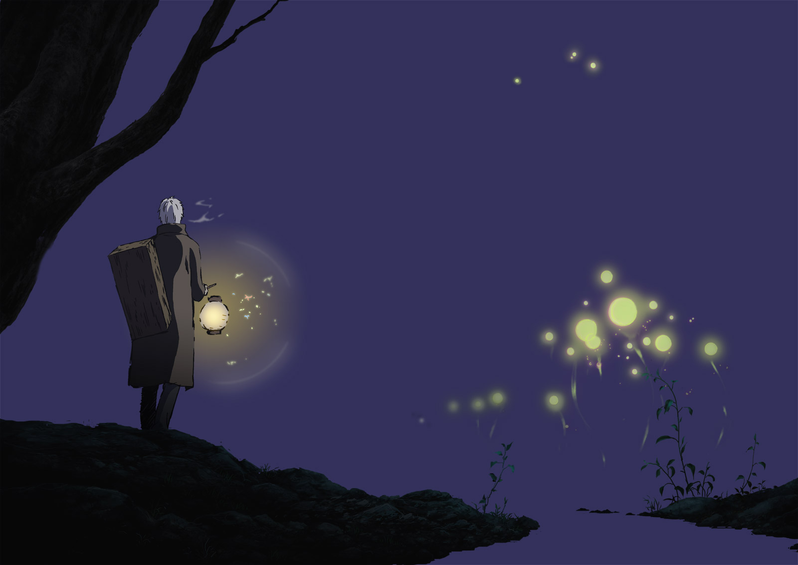 | A hunter roams the mountains at night without the tools of his trade. The being that toys with life and then extinguishes it is a fragile "thing" caught between the realms of man and Mushi. | ||